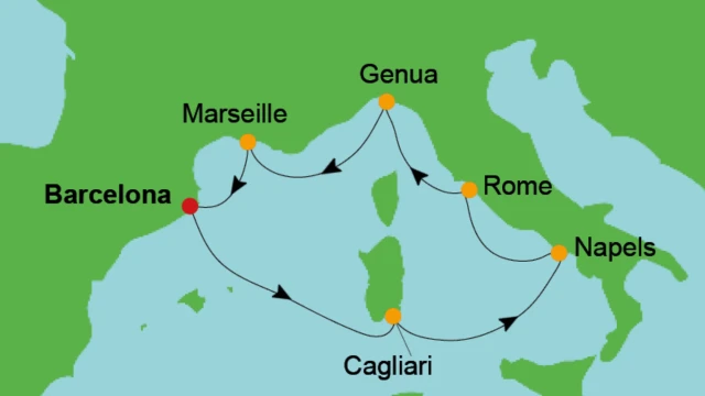 U bezoekt onder andere Cagliari, Napels, Rome (Civitavecchia), Genua en Marseille.