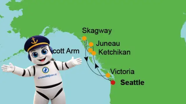 De route omvat onder andere Ketchikan, Juneau, Skagway en Victoria, inclusief scenic cruising langs gletsjers.