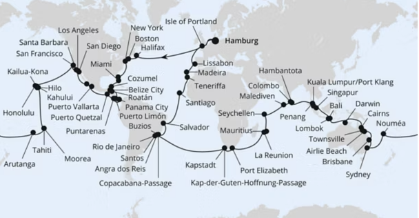 Aankomst in Hamburg. Uw wereldreis komt tot een einde, maar de herinneringen blijven een leven lang.