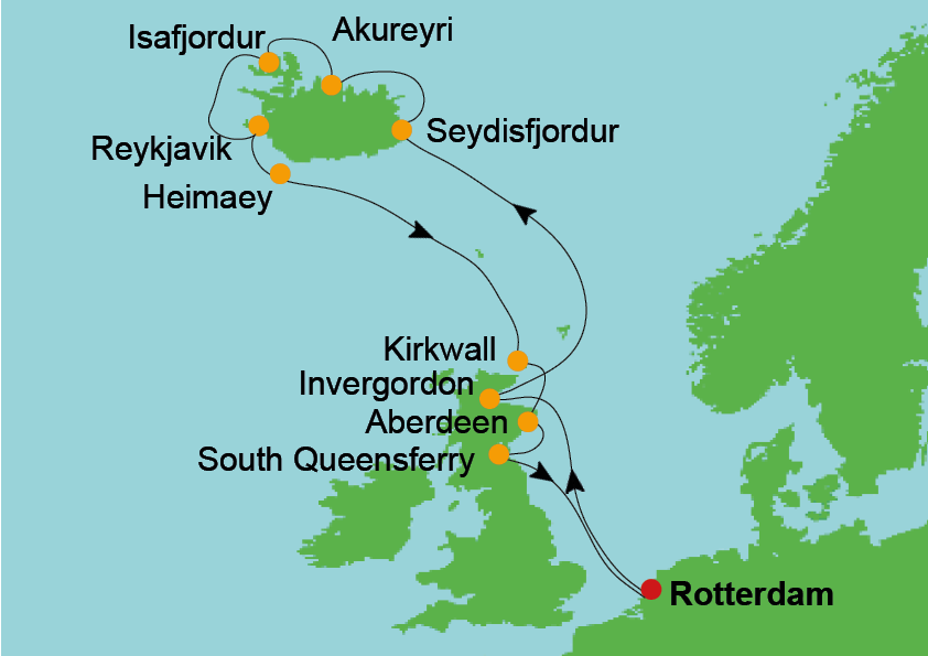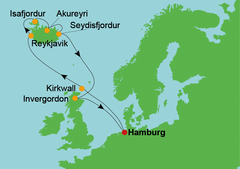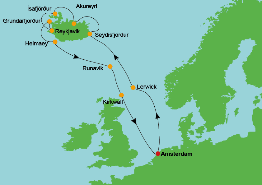 → Reykjavík, Akureyri, Ísafjörður, Húsavík en Seyðisfjörður.