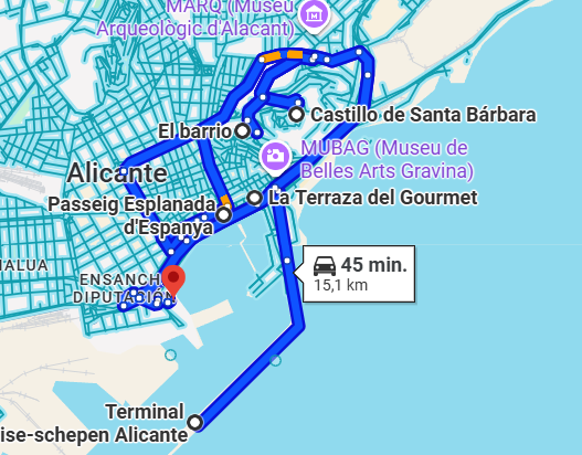 De cruiseterminal van Alicante ligt op ongeveer 1 km van het stadscentrum. U kunt te voet over de promenade naar de stad lopen (ongeveer 10 minuten) of gebruikmaken van een korte shuttlebus. De route voert langs het water en biedt een prachtig uitzicht op de jachthaven en het kasteel. Het Postiguet-strand, de Explanada en de belangrijkste bezienswaardigheden liggen allemaal binnen loopafstand. Taxi’s zijn eenvoudig beschikbaar bij de terminal, maar voor de meeste bezoekers is wandelen de prettigste manier om Alicante te ervaren.