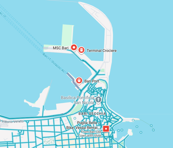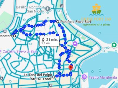 De cruisehaven van Bari ligt op ongeveer 1,5 kilometer van het historische centrum. Je kunt te voet in 15 tot 20 minuten naar Bari Vecchia lopen, of een taxi nemen (ongeveer €10).
