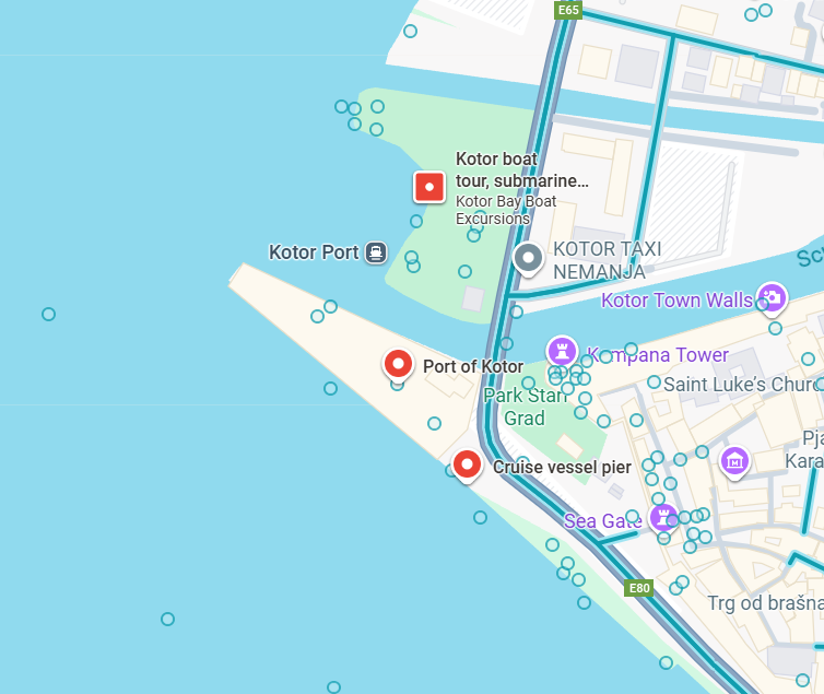 De cruisehaven ligt letterlijk aan de rand van het oude stadscentrum. Zodra u van boord stapt, ziet u de middeleeuwse stadsmuren al voor u. De hoofdpoort van Stari Grad bevindt zich op slechts 200 meter van de pier — u loopt er in minder dan 5 minuten heen.