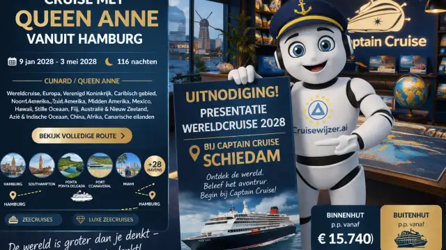 De wereldcruise met de Cunard Queen Anne vertrekt op 9 januari 2028 en eindigt op 4 mei 2028.